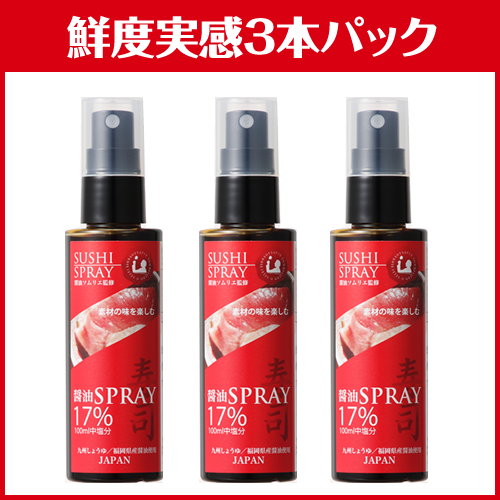 「寿司スプレー」は開業以来、多くのお客様にご愛顧いただいている『福萬醤油』オリジナル醤油です。 福岡県産本醸造醤油(再仕込み醤油)を特殊フィルター加工し、スプレー専用のお醤油を開発しました。 通常のスプレー醤油に充填している濃い口醤油よりも、香り・色の強い再仕込み醤油は、お寿司にぴったり。濃厚な味を好む方へオススメです。少量で十分な香りが楽しめますので、楽しい減塩しょうゆとして活用いただきたい一品です。 ぜひ、あなたのmyしょうゆとしてお役立てください。 内容量 80ml